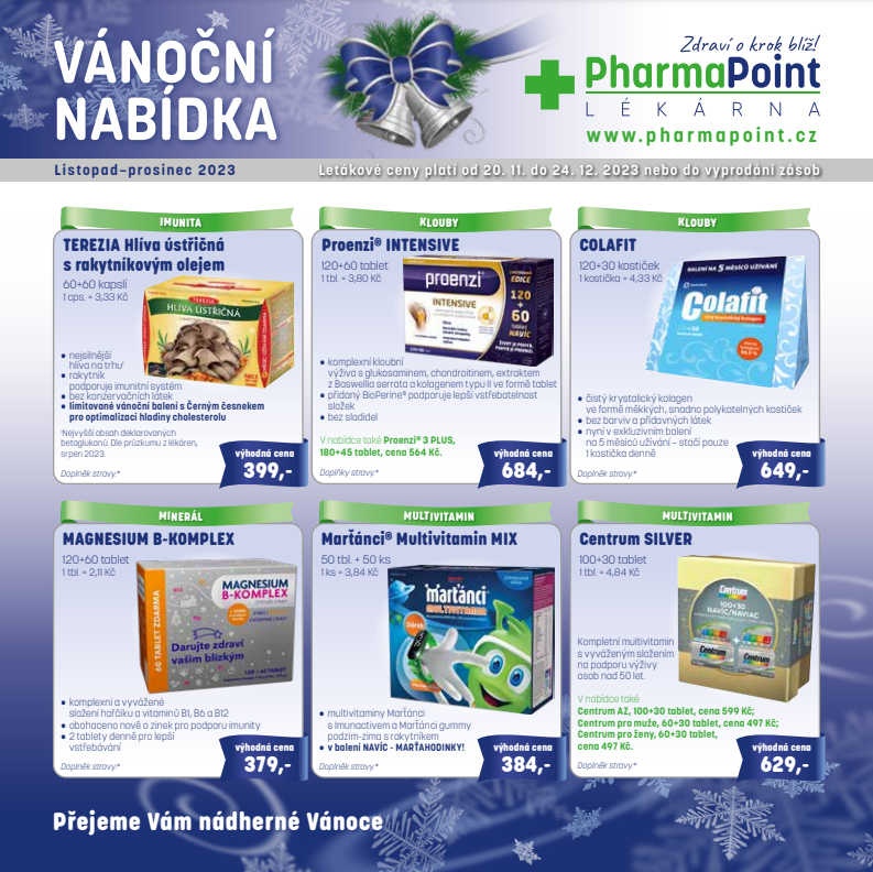 Ať už je vyhlížíte s radostí nebo s obavami, nezadržitelně se blíží....Pokud vaše obavy pramení z tzv. dárkových dilemat, zastavte se u nás pro katalog s vánoční nabídkou, která platí už od 20. listopadu. Nebo Vám třeba padne do oka něco ze sortimentu kosmetiky a je také možné, že odejdete s vánočním balíčkem v nových úžasně pohodlných botách.